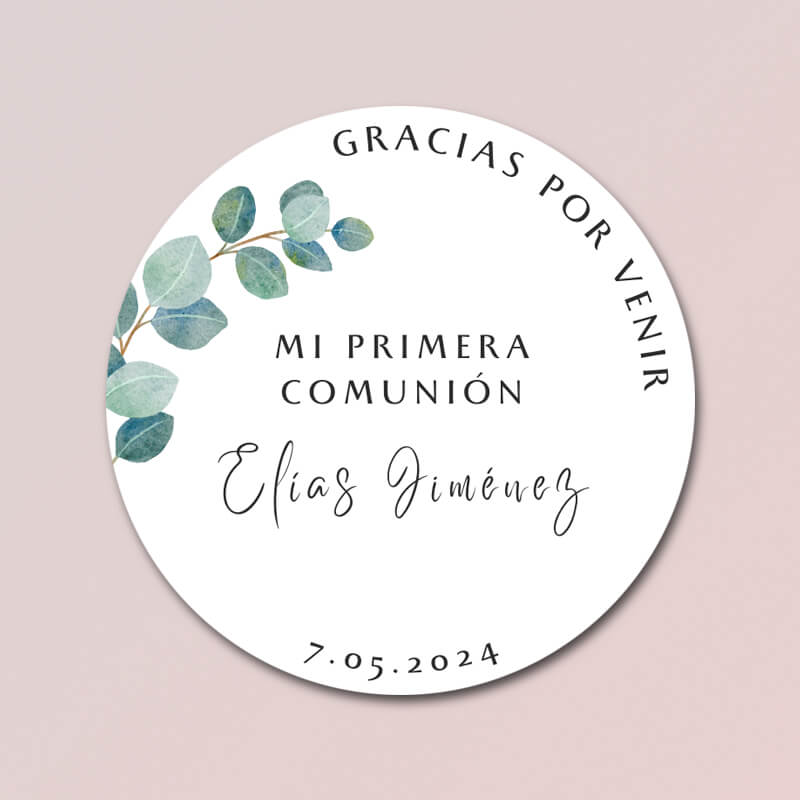 Adhesivo circular de diámetro 60mm en acabado papel, personalizado con el nombre y la fecha de la comunión.