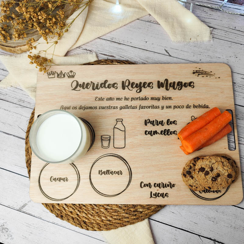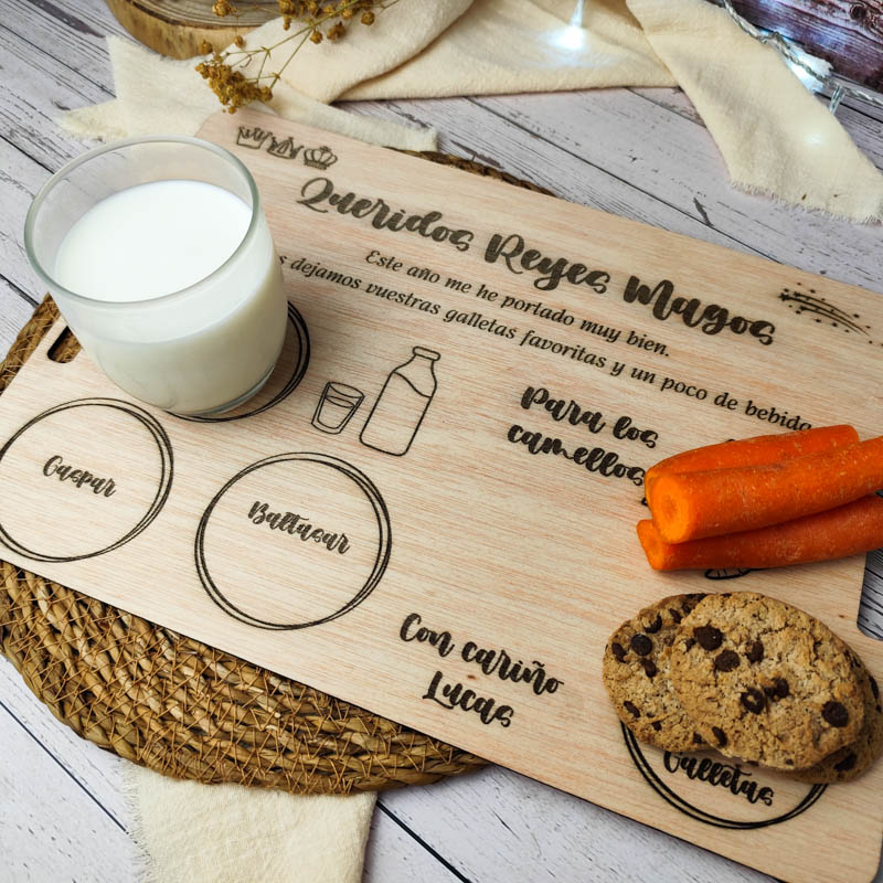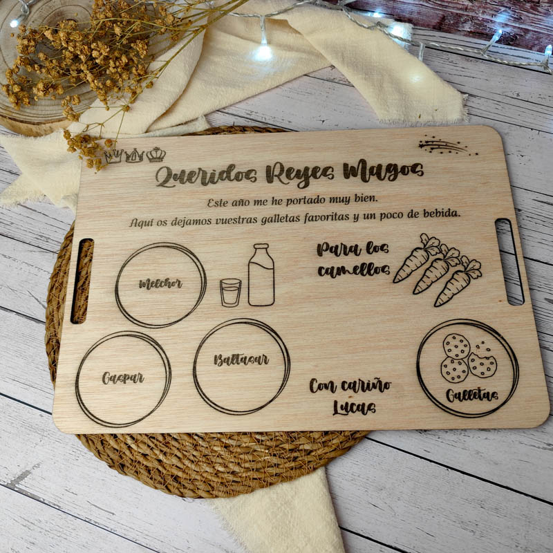 Haz que la llegada de los Reyes Magos sea aún más especial con esta bandeja de madera personalizada con un tamaño aproximado de 345x245mm.
