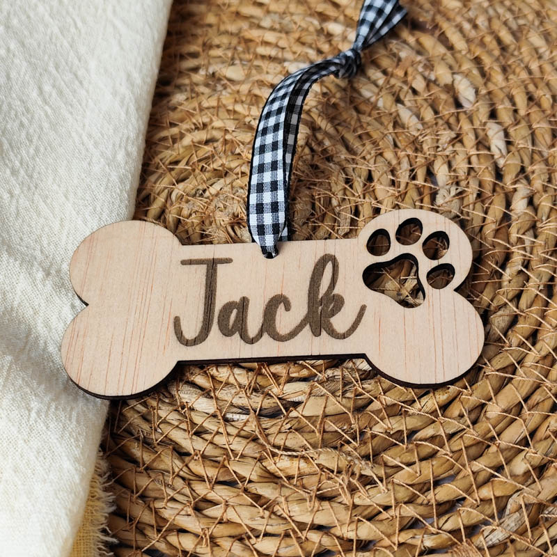 Adorno en madera con forma de hueso de perro, personalizado con el nombre que elijas. Un detalle único para celebrar la Navidad con tu mascota.