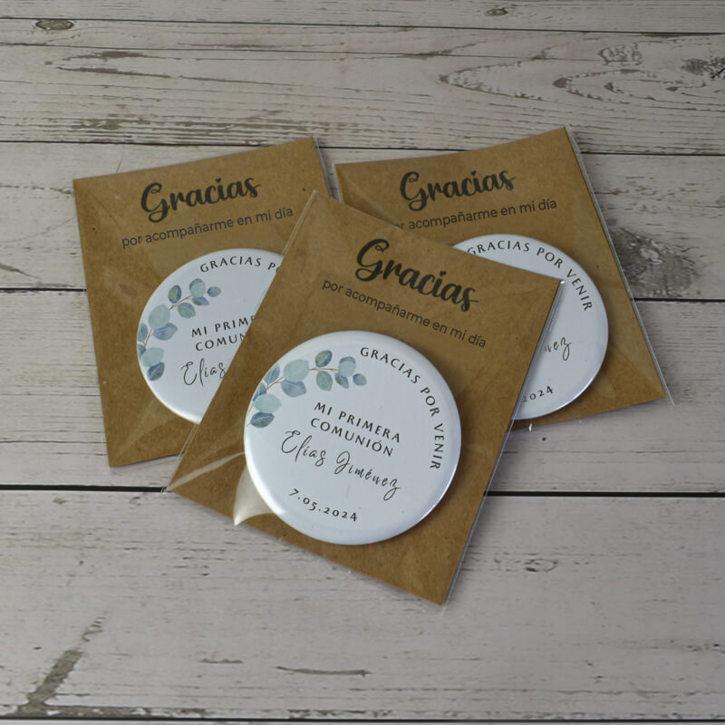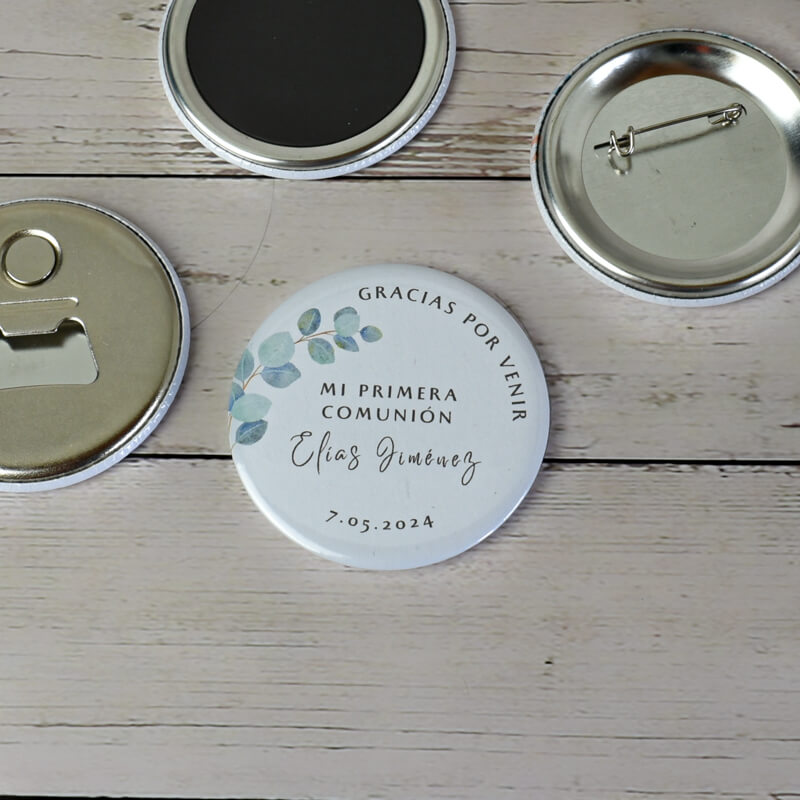 Chapa metálica con 3 opciones a elegir: imán, imán abrebotellas o imperdible con un diámetro de 58 mm personalizado con el nombre y fecha de la comunión.