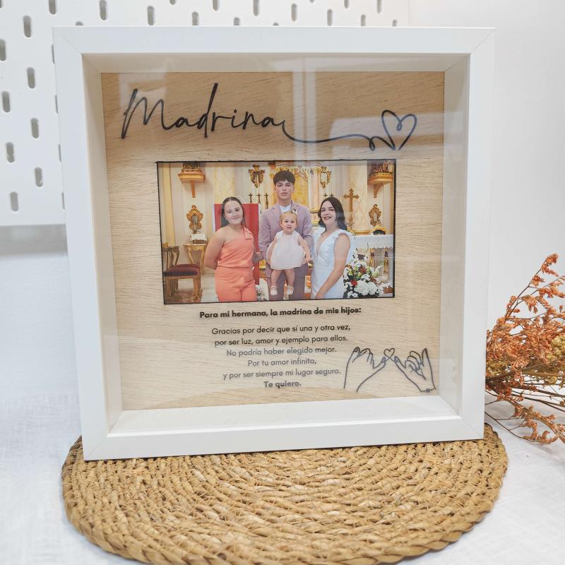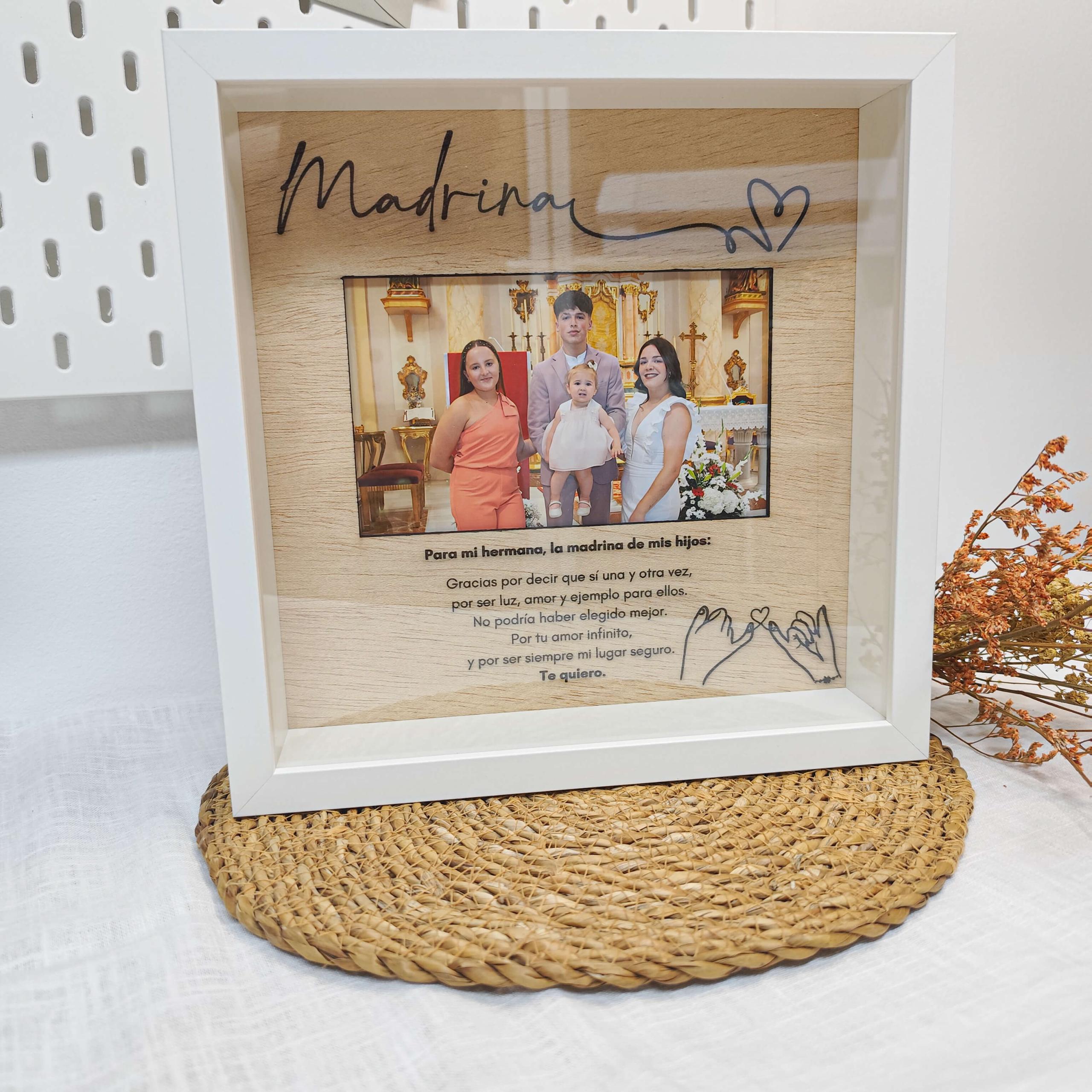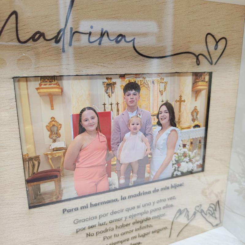 Este cuadro de madera grabado es mucho más que un regalo: es un recuerdo lleno de cariño y significado para la madrina de tu peque.