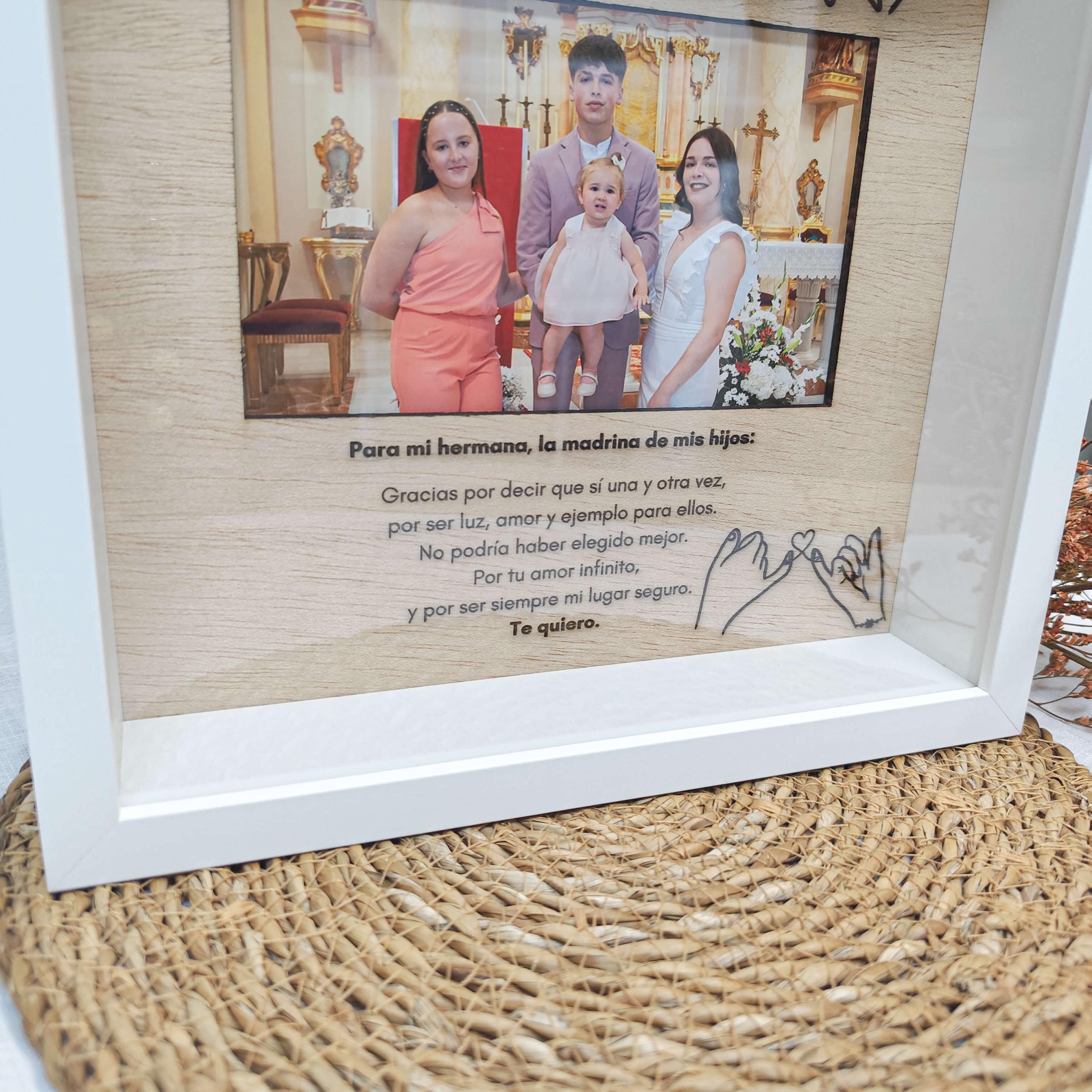 Con un diseño delicado grabado y lleva incluido vuestra foto favorita, este cuadro se convierte en un detalle único que transmite todo lo que ella representa para vuestra familia. Además, puedes personalizar el texto con un mensaje especial o unas palabras que salgan del corazón.