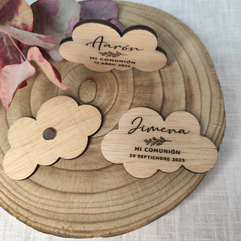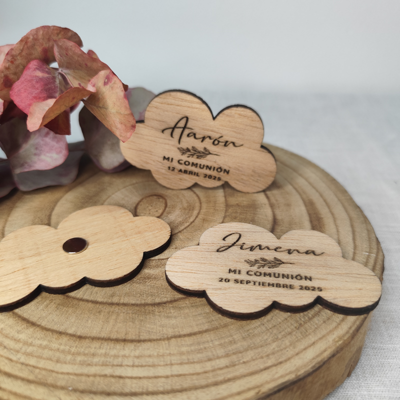 Sorprende a tus invitados con estos elegantes imanes de madera en forma de nube, grabados con el nombre y la fecha de la comunión. Con un diseño original y delicado, se convierten en un detalle único y memorable para recordar este día tan especial.