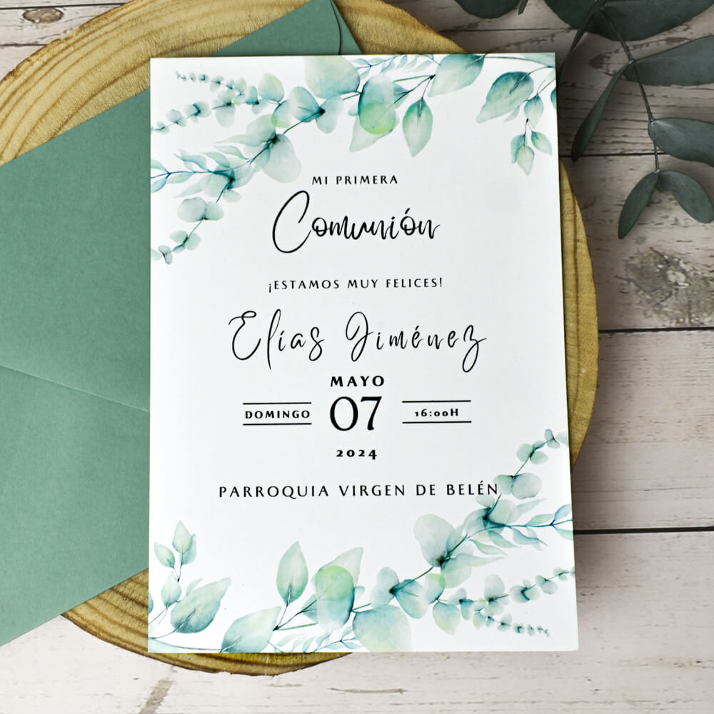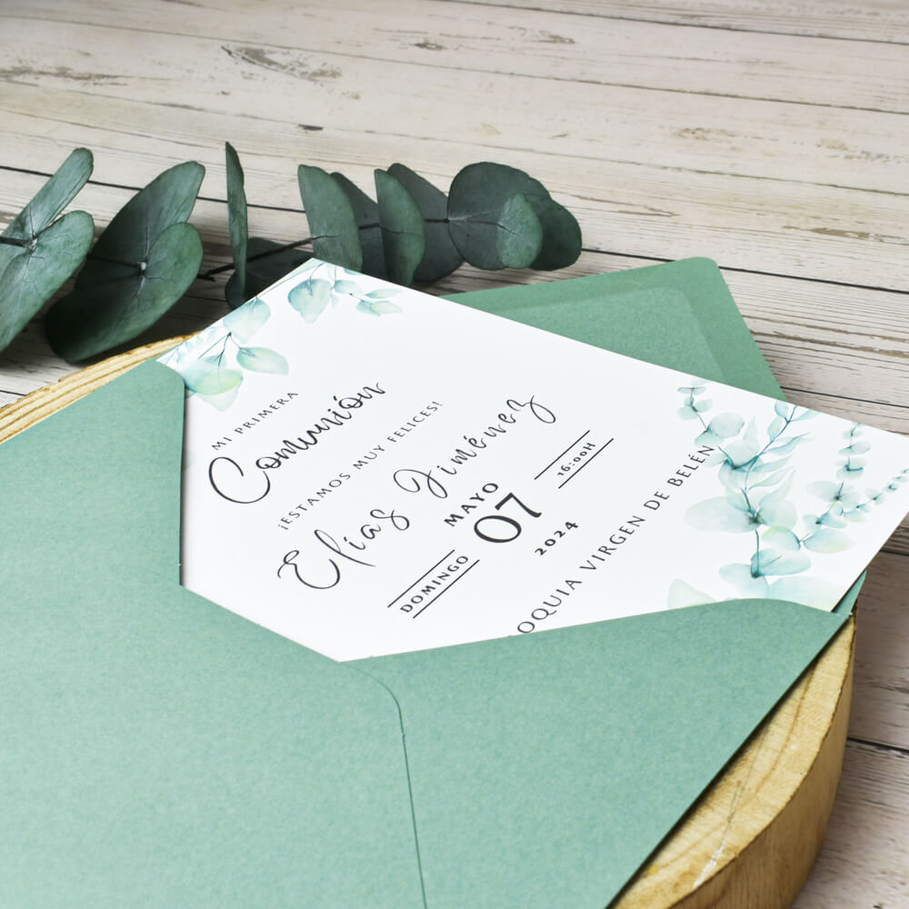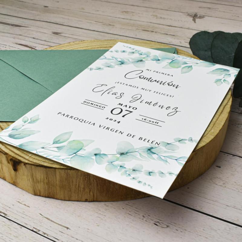 Invitación de papel para comunión elaborada en papel de algodón blanco de 300 gr, con una textura suave y un acabado de alta calidad. Con un tamaño de 124×214 mm, incluye sobre tamaño 125×175 mm del color que elijas.
