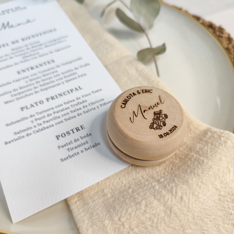 Dale un toque especial a la mesa infantil con estos yoyos de madera grabados con el nombre de cada niño. Perfectos como marcasitios originales y recuerdo de boda, combinan diseño y diversión en un solo detalle.