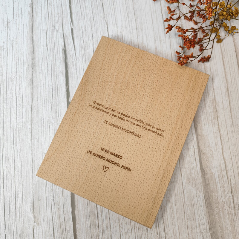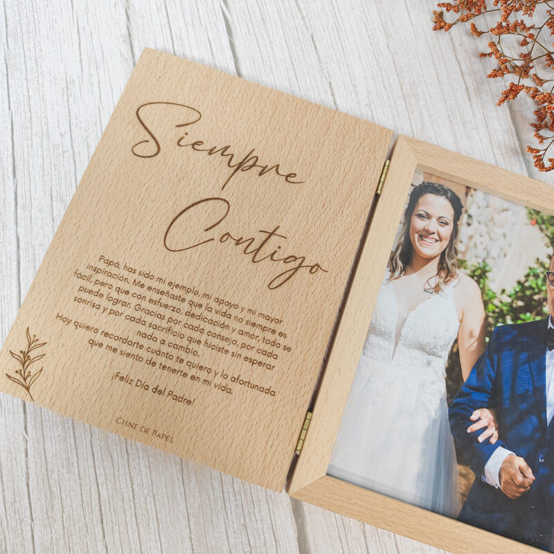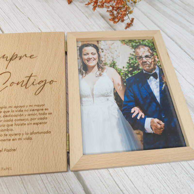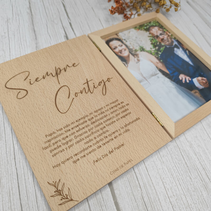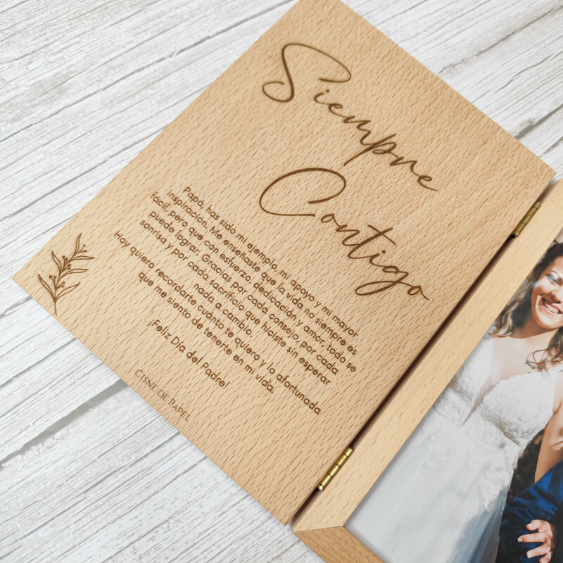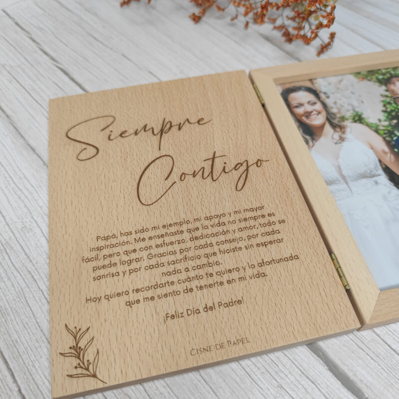 Este diseño único, inspirado en las páginas abiertas de un libro, combina la elegancia del grabado personalizado con el valor sentimental de una fotografía. En la parte exterior, puedes incluir un mensaje especial, una frase emotiva o un diseño dedicado a él, mientras que en el interior encontrarás un espacio para una foto significativa junto con un texto que exprese todo tu cariño.