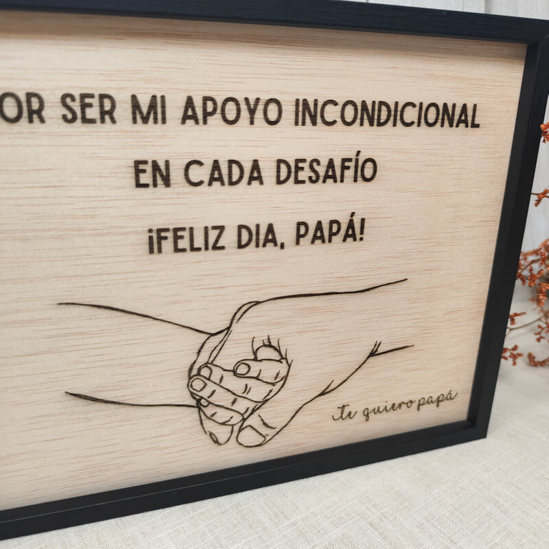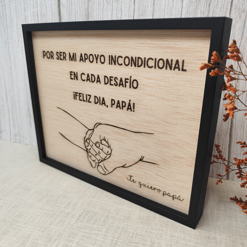 Base de madera grabada con la frase: “Por ser mi apoyo incondicional en cada desafío” ¡Feliz Día, Papá!”