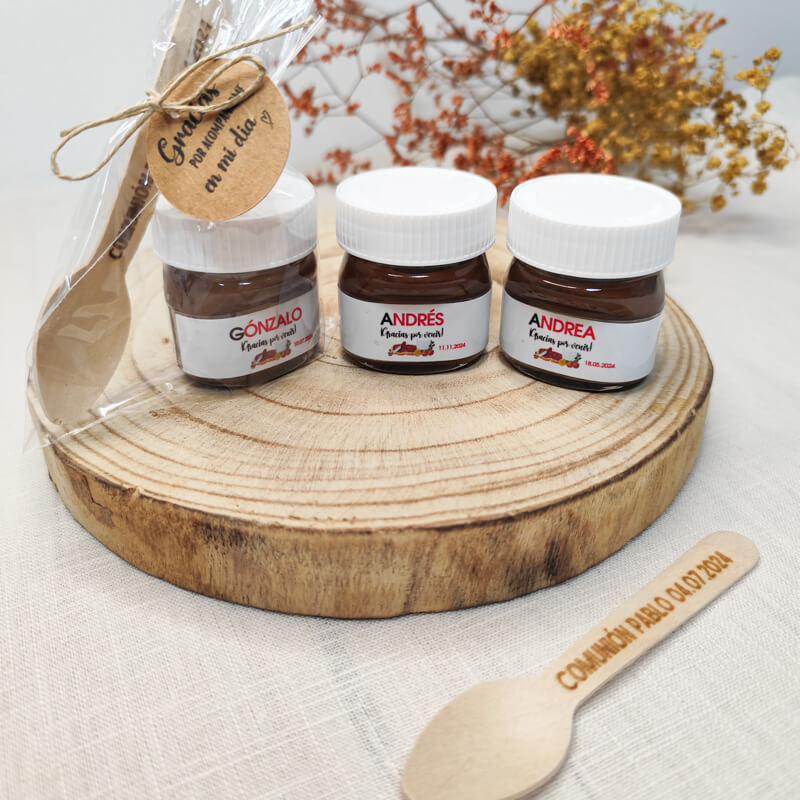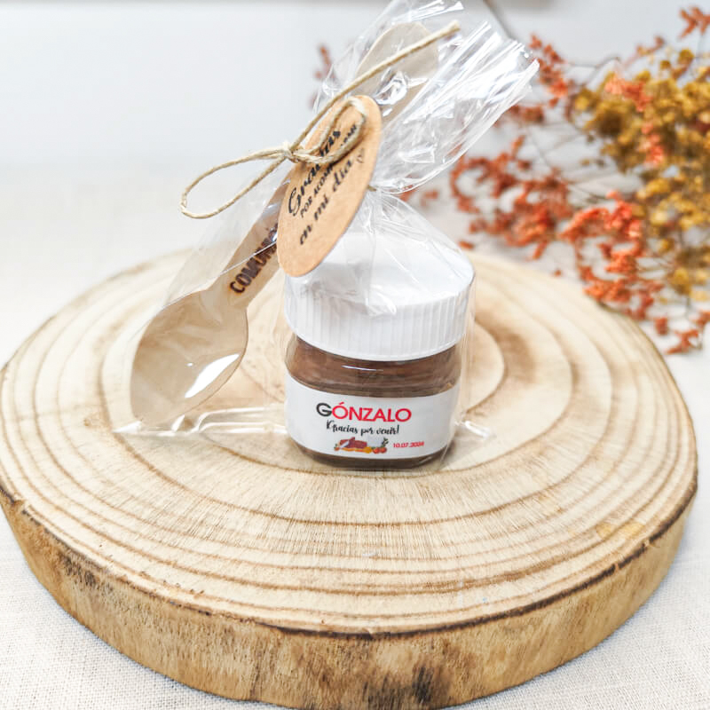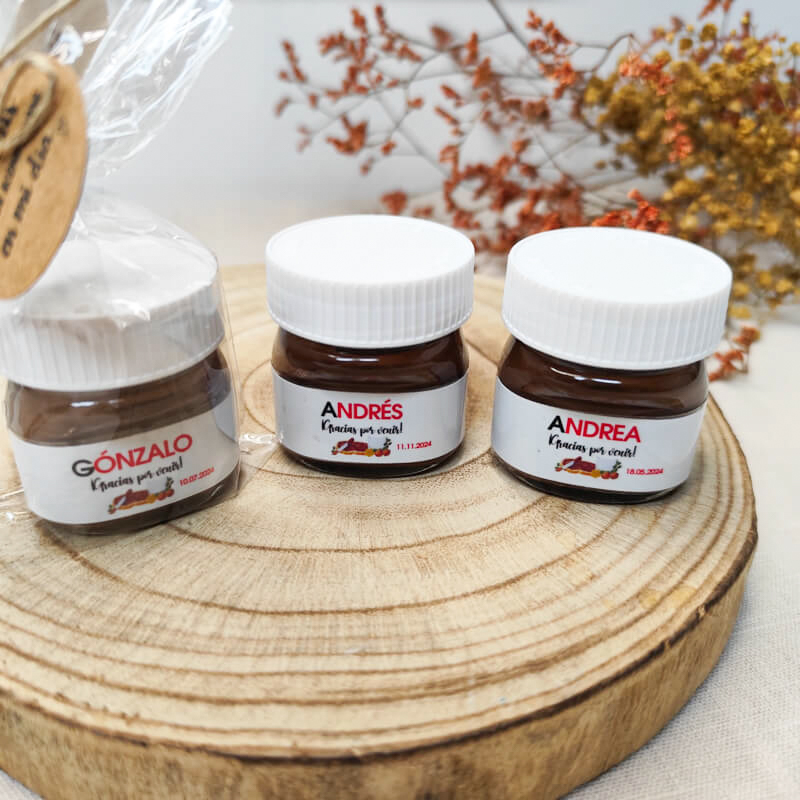 Haz que tu evento sea aún más especial con estas encantadoras mini nutellas personalizadas, un detalle delicioso que encantará a todos tus invitados. Cada tarrito viene decorado con una pegatina exclusiva que incluye el nombre del peque y la fecha del evento, añadiendo un toque único y personalizado, también se puede personalizar con los nombres de cada invitado.