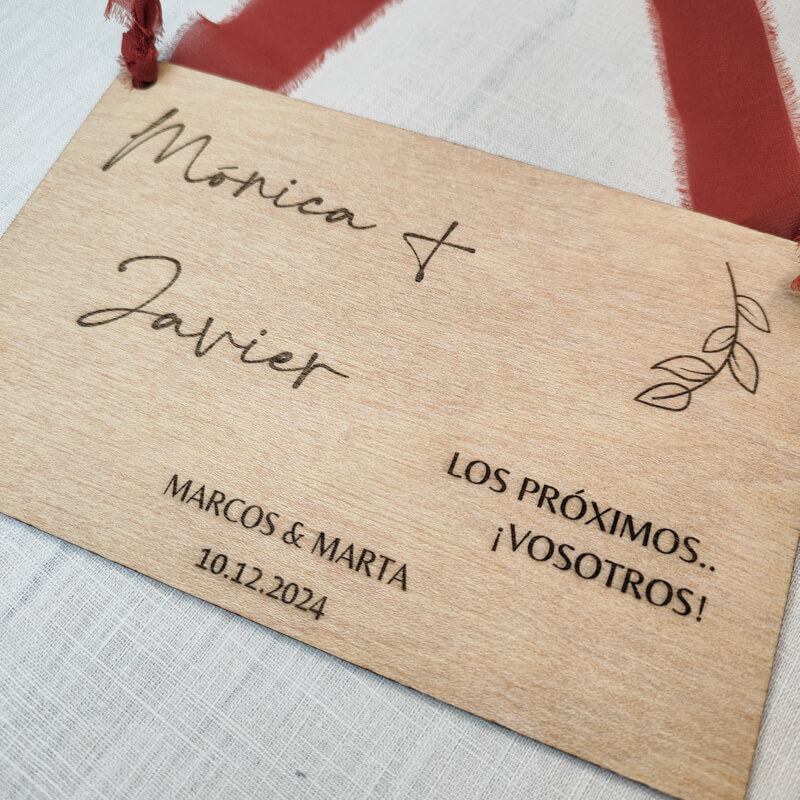 Sorprende a esa pareja especial con esta placa personalizada de madera natural grabada a láser, diseñada para anunciar con estilo quiénes serán los próximos en casarse. Con un tamaño de 225 x 145 mm y un grosor de 4 mm, es ligera pero resistente, perfecta para sujetar o colgar.