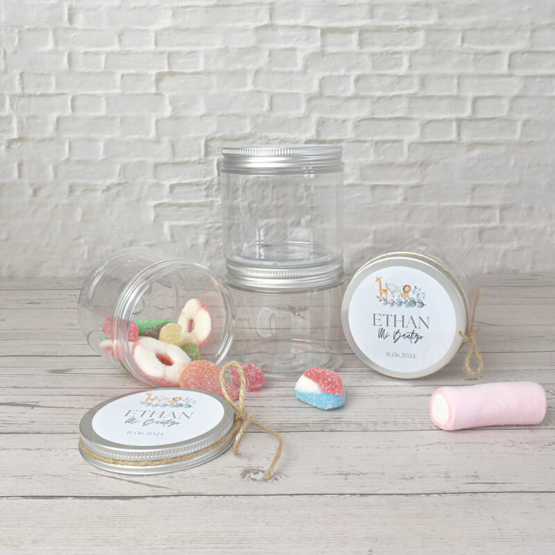 Sorprende a los invitados con este encantador tarro de chuches. Cada tarro incluye un adhesivo personalizado con el nombre y la fecha del bautizo.